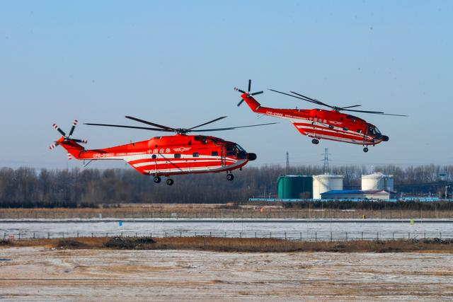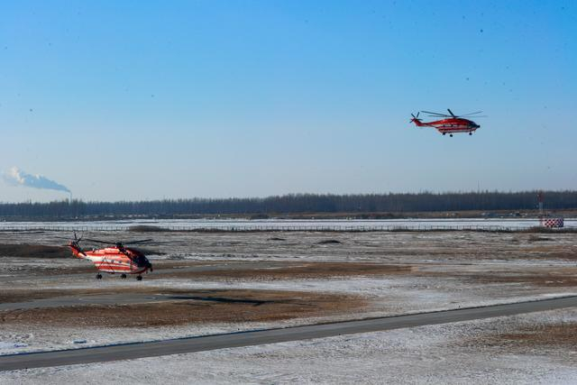1月29日,在空投实战化训练现场,救援直升机陆续完成空投作业后返回。新华社发(闫安童摄)