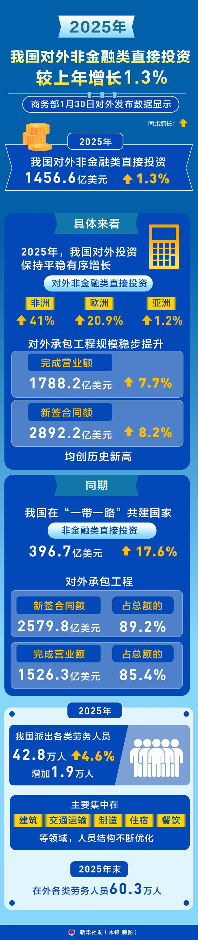 商务部1月30日对外发布数据显示,2025年,我国对外非金融类直接投资1456.6亿美元,较上年增长1.3%。