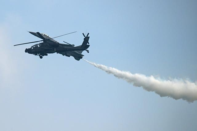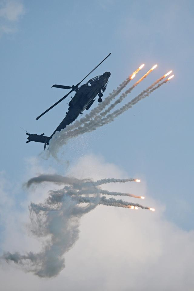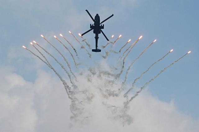 2月1日,在新加坡樟宜展览中心举行的新加坡航展媒体预演上,一架新加坡空军阿帕奇AH-64D直升机进行飞行表演。新华社发(邓智炜摄)