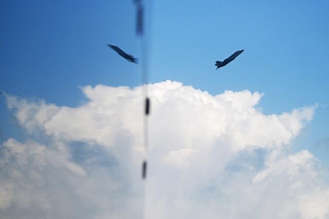 2月1日,在新加坡樟宜展览中心举行的新加坡航展媒体预演上,一架新加坡空军阿帕奇AH-64D直升机(前)和一架F-16C战斗机进行飞行表演。新华社发(邓智炜摄)