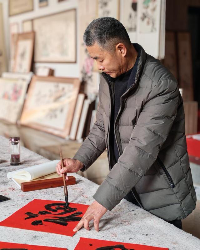 ↑书法家展示题写的福字和春联