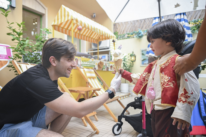 2025年9月30日,来自意大利的亚历山大在他开的冰淇淋店内与顾客互动。
