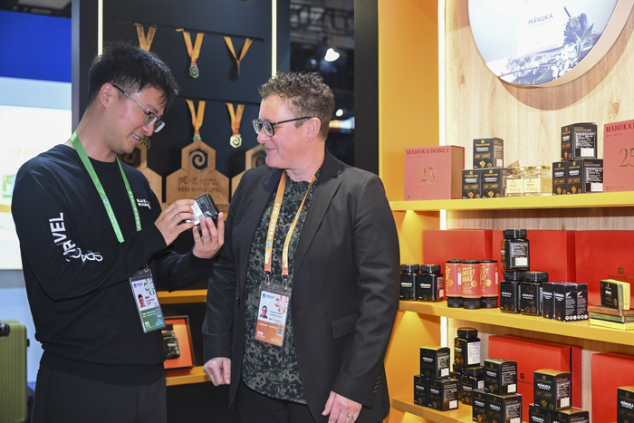 2025年11月6日,在第八届中国国际进口博览会农食产品展区一家新西兰蜂蜜品牌展台,参展商(右)向观众介绍蜂蜜产品。