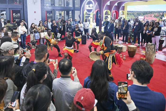 2025年11月7日,乌干达表演者在第八届中国国际进口博览会跳舞。
