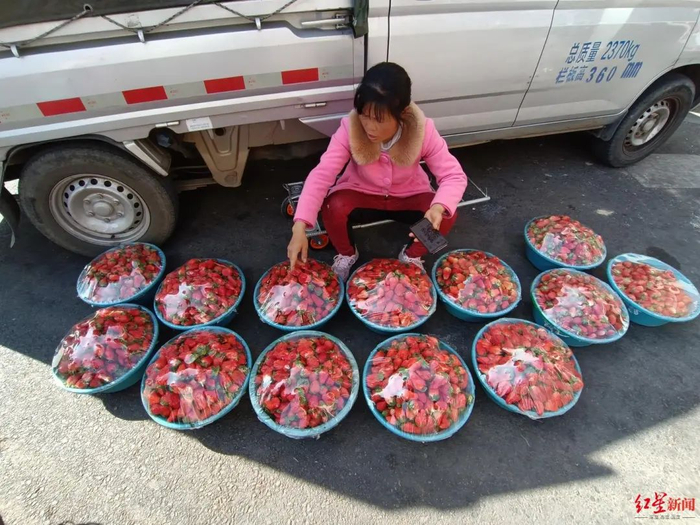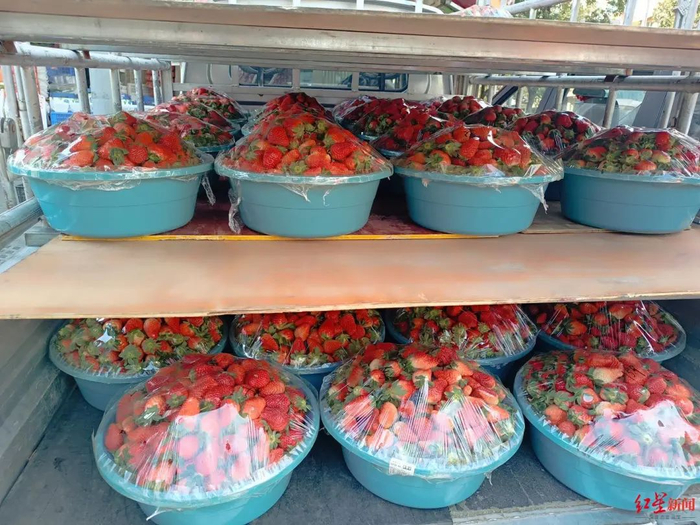 “个头大的2.5元一斤, 个头小的2元一斤,买草莓还送盆。”水果销售商李女士笑着告诉红星新闻,这些货车上的草莓都是按盆卖,“都是从德昌运过来的,每盆草莓十多斤,大果售价30多元一盆,小果售价20多元一盆。”春节前一个月开始,她每天都要在德昌县收购草莓,用货车运至西昌的水果批发市场销售。数据显示,德昌县的草莓种植面积超过1万亩。