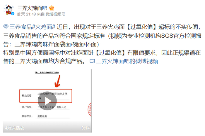 截图自三养食品官方微博号红星资本局注意到,此前有网友质疑,三养食品在中国售卖的火鸡面保质期为12个月,过氧化值超标。