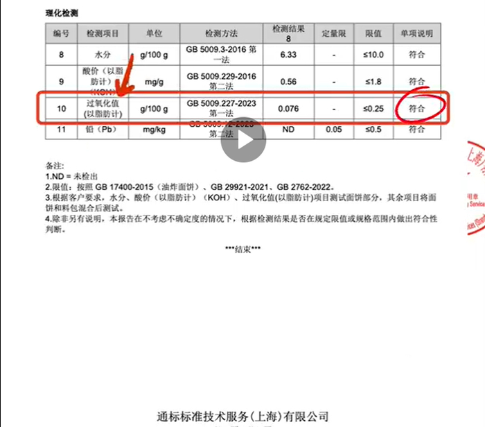 据三养食品2024年6月17日发布的检测结果,其送检的三养辣鸡肉味拌面袋面过氧化值为0.076g/100g,符合国标GB 17400-2015 食品安全国家标准方便面要求的低于0.25g/100g的标准。