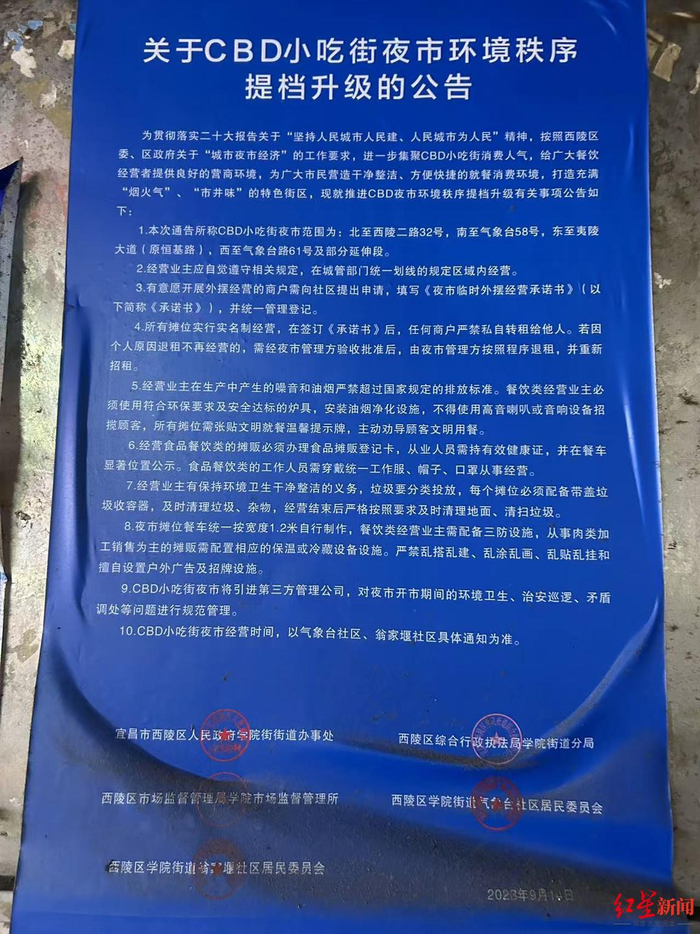 2023年9月,按照西陵区委、区政府关于“城市夜市经济”的工作要求,学院街街道办事处、区综合行政执法局学院街道分局、区市场监督管理局学院市场监督管理所、气象台社区居委会和翁家堰社区居委会联合发布了《关于CBD小吃街夜市环境秩序提档升级的公告》(以下称《公告》)。