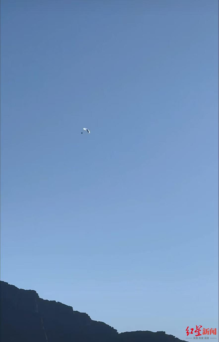 李志失联前的视频显示,其驾驶的白色滑翔伞在空中旋转、挣扎,边下降边飘向山脉的另一侧。