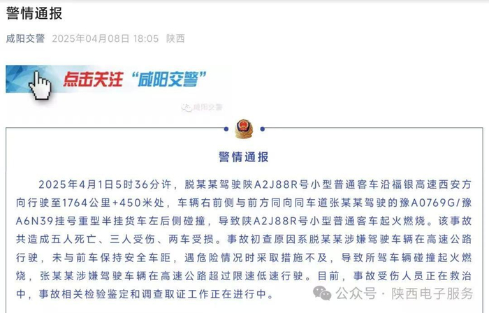 陕西省咸阳市公安局交警支队4月8日通报,4月1日5时36分许,脱某某驾驶陕A2J88R号小型普通客车沿福银高速西安方向行驶至1764公里+450米处,车辆右前侧与前方同向同车道张某某驾驶的豫A0769G/豫A6N39挂号重型半挂货车左后侧碰撞,导致陕A2J88R号小型普通客车起火燃烧。该事故共造成五人死亡、三人受伤、两车受损。事故初查原因系脱某某涉嫌驾驶车辆在高速公路行驶,未与前车保持安全车距,遇危险情况时采取措施不及,导致所驾车辆碰撞起火燃烧,张某某涉嫌驾驶车辆在高速公路超过限速低速行驶。目前,事故受伤人员正在救治中,事故相关检验鉴定和调查取证工作正在进行中。
