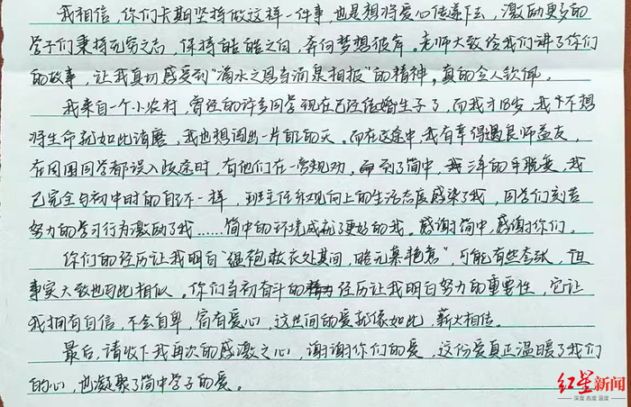 ▲受赠学生回信在信里,这位年轻的校友写道,“我来自一个村庄……我才18岁,不想将生命如此消磨。你们的经历让我明白‘蕴衣蔽袍处其间,略无慕羡意’,你们的奋斗经历让我明白努力的重要性,它让我拥有自信,不会自卑。”