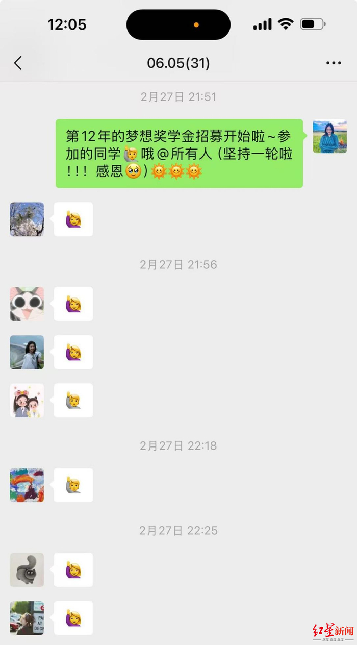 ▲2025年微信群征集回复樊雅新提到的“梦想奖学金”,完整名叫“06高5班校友梦想奖学金”。不是名人或者企业出资,这份奖学金的所有资金,全部来自简阳中学高2006届5班的毕业生们。截至2025年,这个传统已持续了12年。