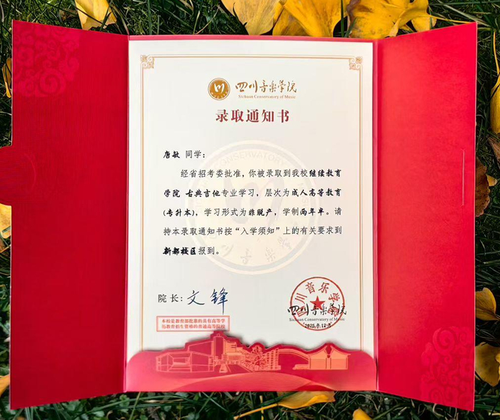 ▲录取通知书唐敏告诉记者,美食和音乐是她青年时期的两大爱好,“退休之后,我有更多的时间去练习吉他,在徐保吉他艺术中心学习了几年之后,发现自己遇到了瓶颈,于是在今年9月份报名了四川音乐学院古典吉他专业的成人自考科目,最终通过考试成为了川音的一名本科生!”