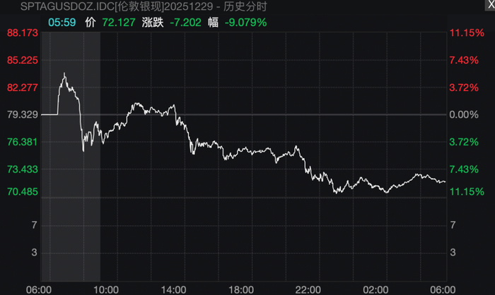 现货白银从周一早盘一度上涨近6%,最终跌超9%,创下自2020年9月以来最大的单日跌幅;现货黄金大跌超4%,创下自10月21日以来的最大单日跌幅,也是今年第二次出现如此幅度的单日暴跌;COMEX黄金期货大跌4.45%,报4350.2美元/盎司;COMEX白银期货暴跌7.2%,报71.64美元/盎司;现货钯金暴跌超15%,现货铂金暴跌超14%。