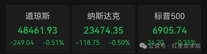截至收盘,美股三大股指集体收跌,标普500指数跌0.35%,纳指跌0.5%,道指跌0.51%。