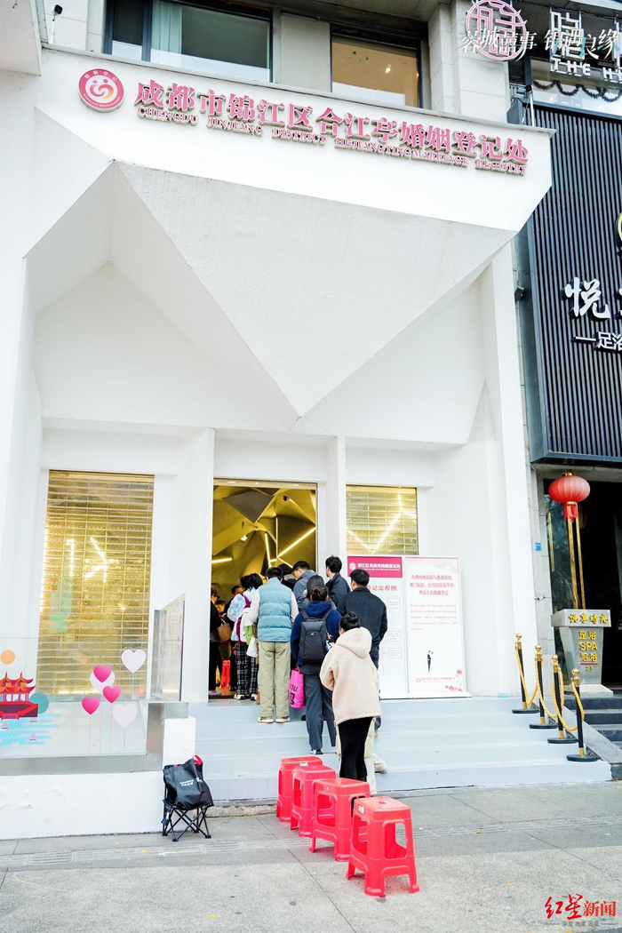 ▲活动现场本次活动深度践行“蓉城囍事”品牌理念,创新推动“票根经济”落地。“我们今天把结婚证变成了一张‘甜蜜消费券’。新人领证后,可以现场参与抽奖,获得酒店、文旅、商圈等多种福利,还能领到新年第一杯定制‘喜茶’,真正实现‘领证即享福’。这也正是我们推动‘甜蜜经济’、促进文旅消费融合的一次生动实践。”锦江区文化体育旅游局相关负责人告诉红星新闻记者。