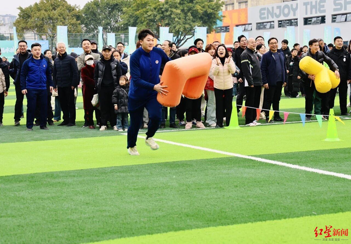 一旁,50米迎面接力赛上,接棒的人身子探出去老远,生怕慢了一秒。“好久没这么跑了,真痛快!”一个穿黄色运动衫的小伙子兴奋地说。