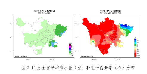 ▲据四川省气候中心与此同时,全省平均降水量偏少42%,位列历史同期第10少位。12月全省平均降水量5.7毫米,较常年同期偏少42%,位列历史同期第10少位。盆南和盆东北10.0~30.0毫米,兴文站全省最多(38.0毫米);攀西地区北部和东南部降水量0.1~2.0毫米,其余大部无降水;川西高原南部和东部降水量0.1~1.0毫米,其余大部无降水。与常年同期相比,全省除盆东北和川西高原西南部偏多外,其余大部偏少1~9成。全省有39县站无降水,主要分布在攀西地区和川西高原。