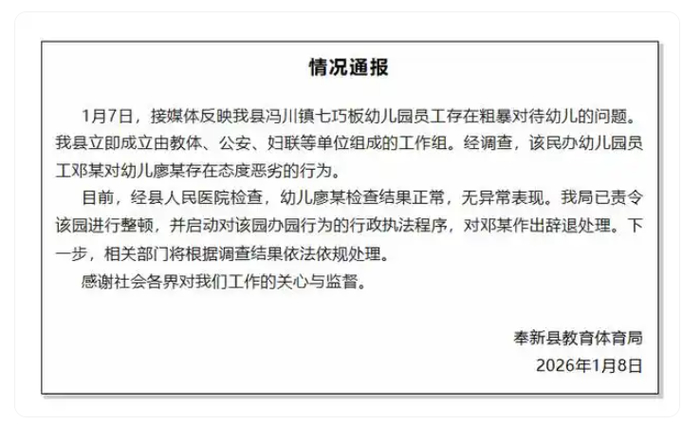 1月8日,奉新县教体局也就此事发布情况通报,称当地已就此事立即成立由教体、公安、妇联等单位组成的工作组。经调查,该民办幼儿园员工邓某对幼儿廖某存在态度恶劣的行为。经县人民医院检查,幼儿廖某检查结果正常,无异常表现。教体局已责令该园进行整顿,并启动对该园办园行为的行政执法程序,对邓某作出辞退处理。下一步,相关部门将根据调查结果依法依规处理。