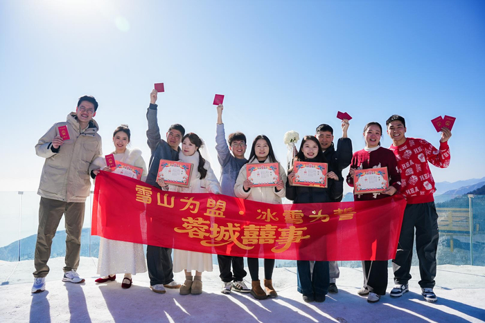 新人完成登记后,不仅能收到成都专属的定制婚书和限定小礼品,更能体验一系列浪漫活动。牵手漫步积雪覆盖的雪山徒步栈道,踩下深浅相依的脚印,感受“共赴白头”的美好隐喻;或是走进雪山邮局,写下承载心意的爱情明信片,盖上冰雪季限定邮戳,寄给未来的彼此。“雪山的圣洁感把仪式感拉满,每一片飘落的雪花,都是我们爱情的见证者。”来自成都的新人李女士望着身旁的爱人,眼里满是笑意。
