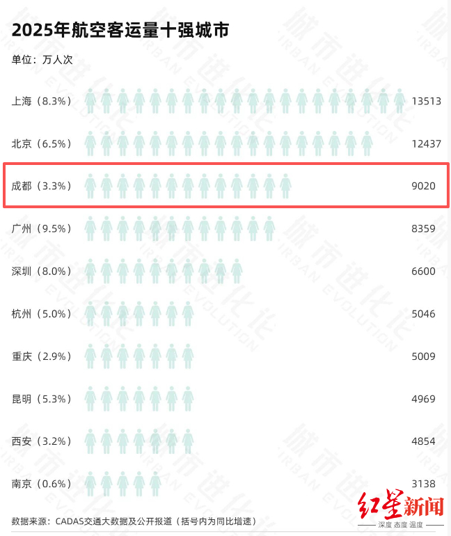 2025年,上海浦东、广州白云均创下历史新高,跻身全球十大机场行列,成为中国机场流量的顶流。CADAS交通大数据显示,2025年多个机场客流量实现突破,全国超1000万人次吞吐量的机场增至41座,5000万级机场俱乐部扩容至9座,行业竞争日趋白热化。在此背景下,成都交出了一份含金量十足的成绩单——