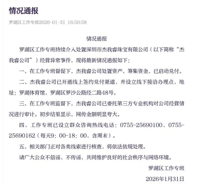 红星资本局1月31日消息,1月31日,深圳罗湖区工作专班发布情况通报,通报显示,在工作专班督促下,杰我睿公司处置资产、筹集资金,已启动兑付。在工作专班监督下,杰我睿公司已委托第三方专业机构对公司经营情况进行审计。初步结果显示,网传金额明显夸大。