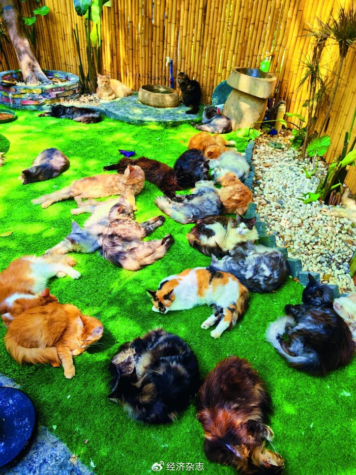鉴于“猫街”这样的项目本身就具有吸引人流的特质,因此在众多城市商业综合体中,其选址往往不受限制,有时安置于顶层区域,反而能为下层商户带来额外的客流量,因而深受各大商场的青睐。与“猫街”所处的都市环境不同,“夜猫森林”则选择在白云山脚下的室外区域扎根,追求一种闹市中的宁静。据负责人张立军介绍,该项目所在地当初是一块荒地,一期工程约为6000平方米,将800多只猫分别安置在百宠园、虎豹狼街等4个主题园区里。记者进入百宠园,一只稀有的狼猫尾随身后,其他猫则或缓步漫游,或在阳光下沉睡。园区内配备了完善的设施,包括水系、景观、猫舍、雨棚以及专门为猫咪设计的饮水和进食器具。据张立军介绍,该园内主要是一岁以下各种品种的猫咪,数量超过200只;虎豹狼街中的猫都有着美丽的花纹,包括玩具虎、孟加拉豹猫、奥西猫等珍贵品种,其中玩具虎是猫界的劳斯莱斯,而奥西猫则被誉为猫界的爱马仕;公主猫街则以布偶猫为主,而森林三兄弟园区则居住着缅因库恩猫、挪威森林猫和西伯利亚森林猫。