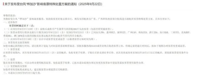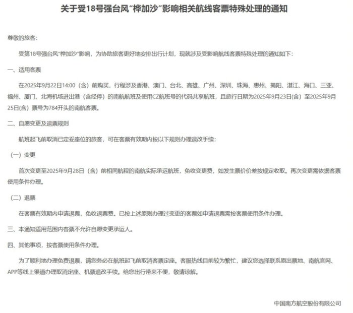 其中,南航表示,23日、24日在惠州平潭机场的航班全部取消;23日在台北桃园机场的航班全部取消;24日在澳门机场的航班全部取消;同时提前取消23日进出珠海金湾机场航班21班;取消23日在香港机场的CZ603、CZ604、CZ5009航班,24日航班全部取消;深圳宝安机场23日出港航班起飞时间安排在20:00前执行,23日进港航班落地时间安排在18:30前执行。