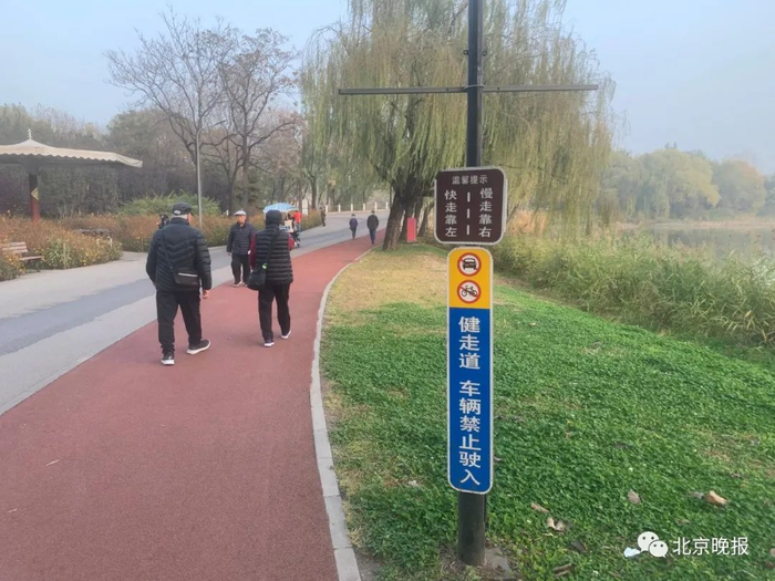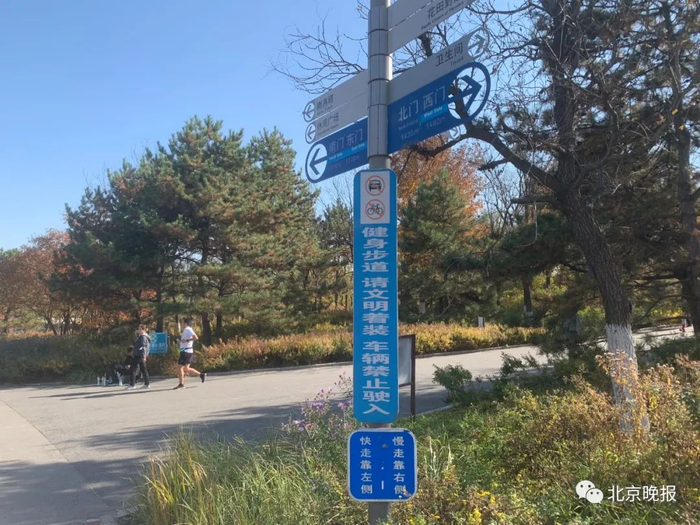 在跑道上锻炼到底有没有规则?记者探访发现,其实在一些公园的跑道旁,每隔一段距离都竖立着“温馨提示”。如在奥森公园和朝阳公园,提示牌上面写着“健步道上车辆禁止驶入”和“快走靠左、慢走靠右”。
