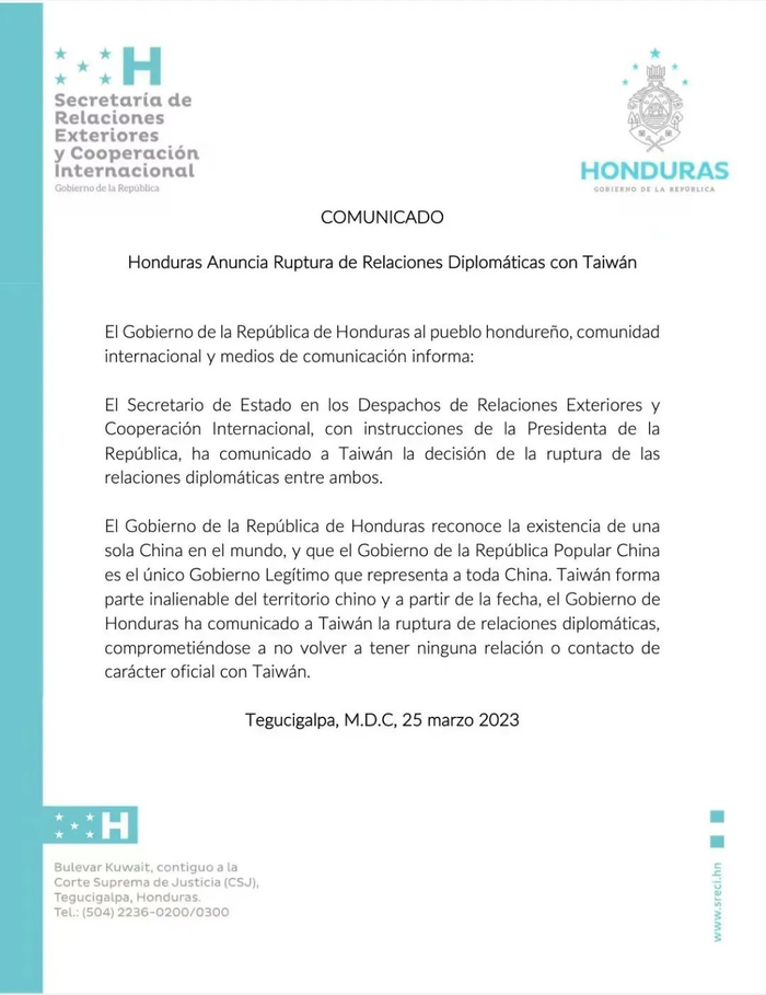 当地时间3月25日,洪都拉斯外交部发表声明,正式宣布与中国台湾断绝“外交关系”。