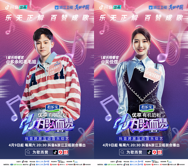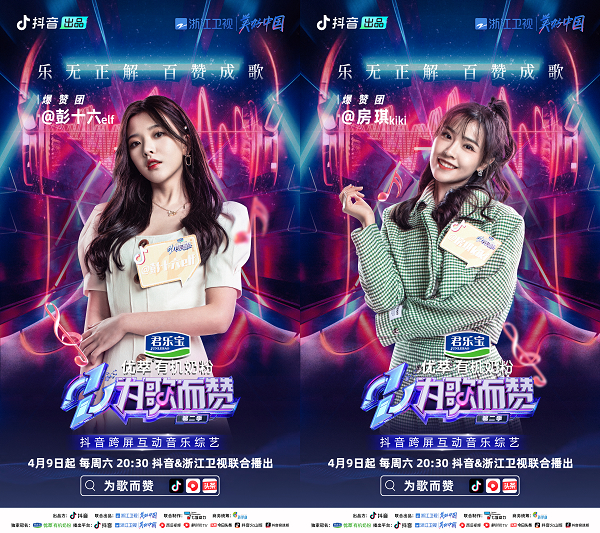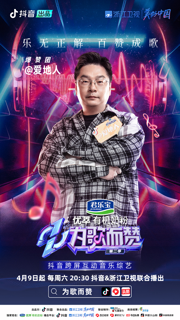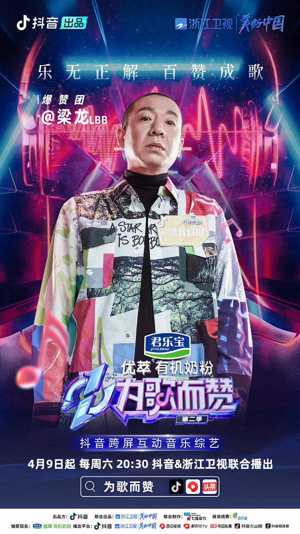 由抖音出品,在抖音和浙江卫视播出,西瓜视频、鲜时光TV、今日头条、抖音火山版、抖音极速版联合播出的跨屏互动音乐综艺君乐宝优萃有机奶粉《为歌而赞》第二季,将于4月9日起每周六20:30播出。本季爆赞团成员有:梁龙、陈铭、爱地人、彭十六elf、房琪kiki,爱乐陪看官:多余和毛毛姐、吴佳煜。来自不同领域的他们,这季又会给大家带来什么样的观点呢?