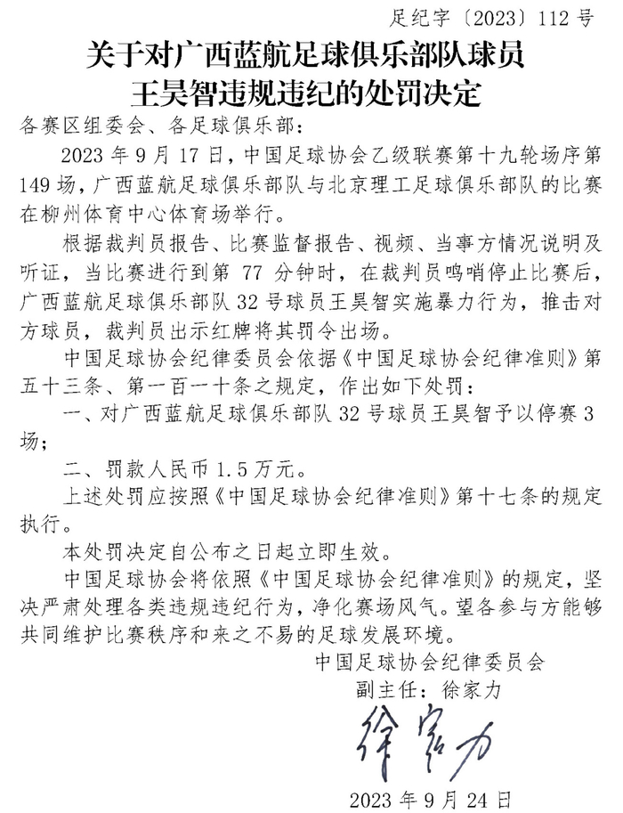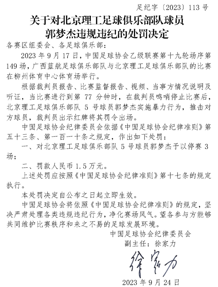 (原标题:足协罚单×2!北京理工和广西蓝航各一名球员被禁赛)