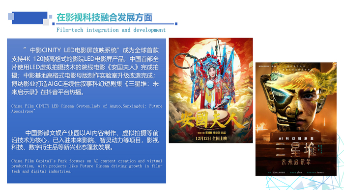 科技与影视在此深度融合。中国影都在数字视听技术方面处于国际领先地位,中影CINITY LED电影屏放映系统成为全球首款支持4K 120帧高格式的影院LED产品,《安国夫人》成为首部全片使用LED虚拟拍摄技术的国产院线影片;博纳影业打造的AIGC短剧《三星堆:未来启示录》成为线上热播作品。影视科技和数字衍生品产业在怀柔实现了从“概念”到“落地”的快速跃迁。