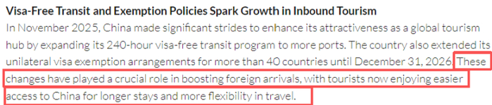 文章分析认为,2025年11月,中国将240小时过境免签政策扩大到更多口岸,并将40余国单方面免签政策延长至2026年12月31日,以增强中国作为全球旅游目的地的吸引力。这些变化在促进外国游客入境方面发挥了至关重要的作用,游客现在可以更轻松地入境中国,停留更长时间,旅行方式也更加灵活。