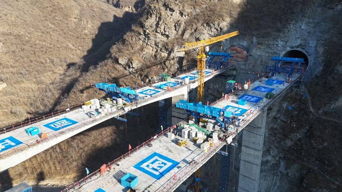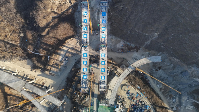 河东村隧道西出口的峭壁旁,便是刚刚合龙的东庄子大桥。这座大桥横跨白石沟,全长518米,主桥采用 T形刚构设计,主跨达到70米、主墩高度超30米。而引桥则要跨越现有的国道108线和正在建设中的国道108三期。施工过程中,东庄子大桥面临汛期降雨、冬期低温、森林防火期管控、高处作业风险等多重考验。为此,项目团队科学制定工期计划,利用有限的作业时间,采用三班倒、提前开展混凝土的升温保湿措施等,推动4个主墩同时施工,实现平均8天一个节段的高效施工节奏。