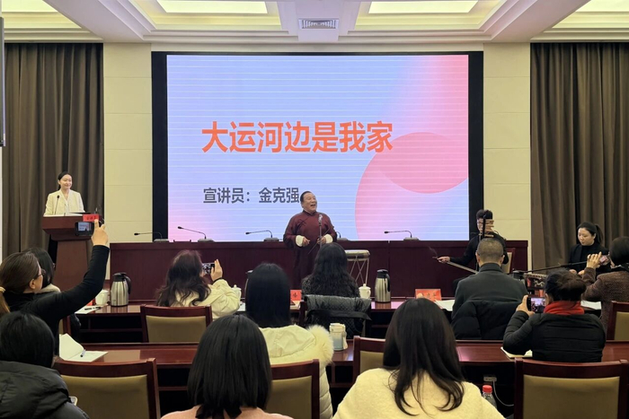 通州区宣讲团以《运河映京华 文化践新程》为题,分“从中国智慧到世界遗产、从漕运京畿到文化引擎、从保护传承到活化利用”三个维度,结合精彩的北京琴书《大运河边是我家》和北京大运河文创礼物故事,生动阐释传承运河文化赋能新时代北京发展的生动实践。