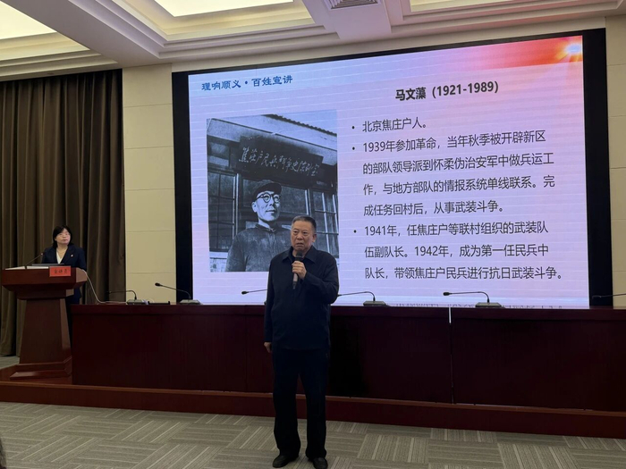 顺义宣讲团以《人民伟力 胜利之本》为题,结合抗战后代讲述父辈抗战烽火往事和评书故事,生动展现在党的领导下焦庄户村民英勇抗击日寇的感人事迹,带领大家重温历史、汲取力量,深刻感悟“兵民是胜利之本”的深刻内涵。