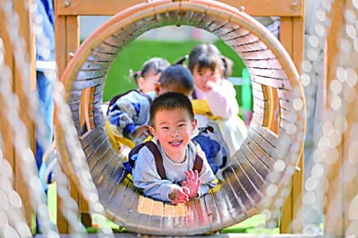 山东青岛,托育班的小朋友在游乐场玩耍。新华社发