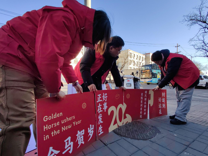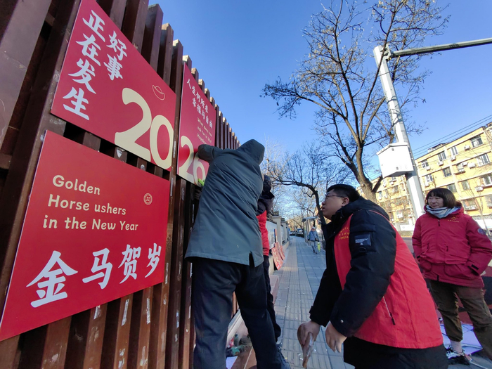 社区的祝福墙,成为今年布设的核心亮点,也成了社区同心协作的温馨舞台。社区工作者和居民们自发组队,有的搬运物料、有的清理墙面、有的粘贴装饰板,还有的悬挂装饰,大家分工协作、默契配合,脸上都洋溢着笑容。如今,墙上“2026你好运开始”几个醒目大字已然成型,搭配着马年吉祥祝福语,“金马贺岁”“马到成功”“山河皆无恙,策马踏新程”等话语字字暖心,传递着社区和居民的美好期许。