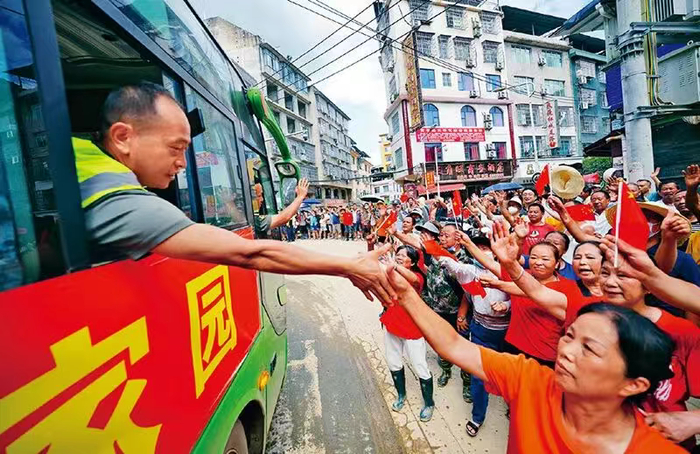 党的十八大以来,中国共产党人继承和发扬党的优良传统和作风,始终保持同人民群众的血肉联系。近期,贵州省榕江县发生特大洪涝灾害,党员干部冲锋在前,构筑起保护群众、守护家园的坚固防线。图为2025年7月3日,当地群众自发涌上街头,送别救援队伍,表达感激之情。 新华社发 杨武魁/摄