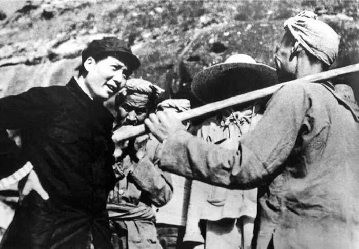 延安时期,毛泽东同志等老一辈革命家住窑洞、吃粗粮、穿布衣,用“延安作风”打败了“西安作风”。图为当年毛泽东同志在延安杨家岭询问农民的生产和生活情况。 新华社发