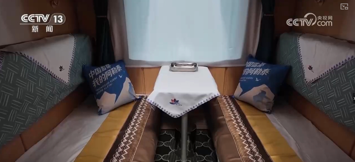 据介绍,这趟列车紧扣冰雪主题,列车外观和内饰均与阿勒泰地区的自然风光和冰雪运动相关。