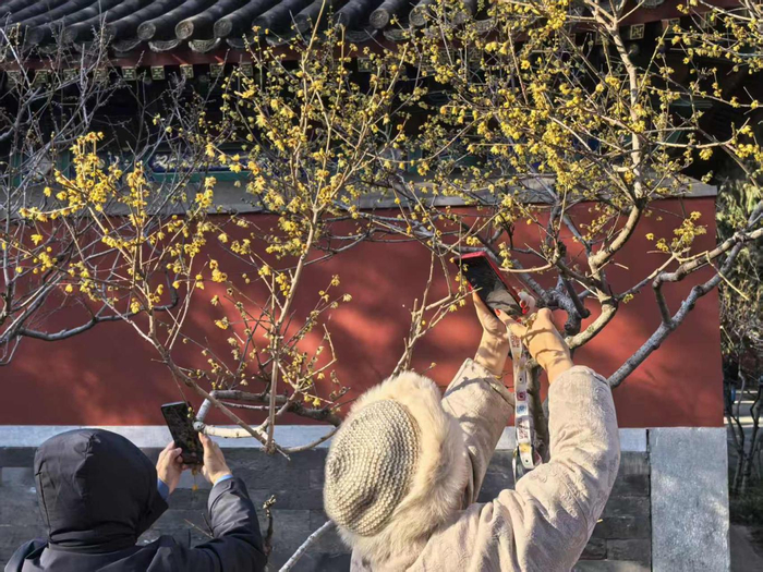国家植物园地势开阔,已逐渐成为市民游客短途出行、亲子徒步的又一目的地。此时位于北园卧佛寺内的数株早花蜡梅正值盛花期,金黄的花朵缀在枝头,暗香浮动,虬曲的枝干搭配素雅的黄花,与古建红墙相映成趣,吸引游客们驻足观赏拍照留念,记录下这冬日限定美景。天王殿前的池塘里,数百尾红鱼游荡其间,新年见鱼,年年有余,游客们在这里拍照打卡,许下新一年的美好愿望。
