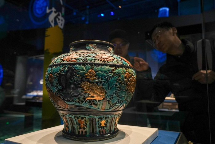 沿着展线前行,“走进沉船”单元中,两艘明代“宝船”依次揭开面纱,377组件出水文物,再现明代中期海上丝绸之路的繁华盛景。一批珐华彩瓷器无疑是展厅里的“明星”,围满了观看、拍照的观众。