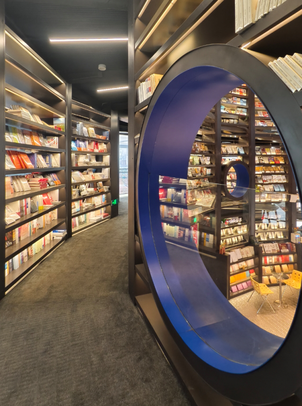 低饱和度工业风的书架褪去浮华,让书籍成为绝对主角,灯光洒落间更显书页鲜活,恰如其分地成就了“书为景、境为托”的质感。米俊仁团队大胆在1.2米宽的夹道两侧摆满书架,他坦言:“科研生活偶尔会有些枯燥,我想在这儿加些趣味设计,让人足够贴近书,才能真正感受文字的力量。”而坡道路径交汇处的“短路”区域设计,巧妙衔接外围休闲阅读区域,预留“相遇角”,供人休憩畅谈,让人文与科学思想在此悄然碰撞。市民林女士感慨:“比起传统书店的刻板,这里步步是惊喜。‘虫洞’望穿书影,坡道漫随思绪,恰似在知识宇宙中漫步,每一步都藏着与美好相遇的可能。”