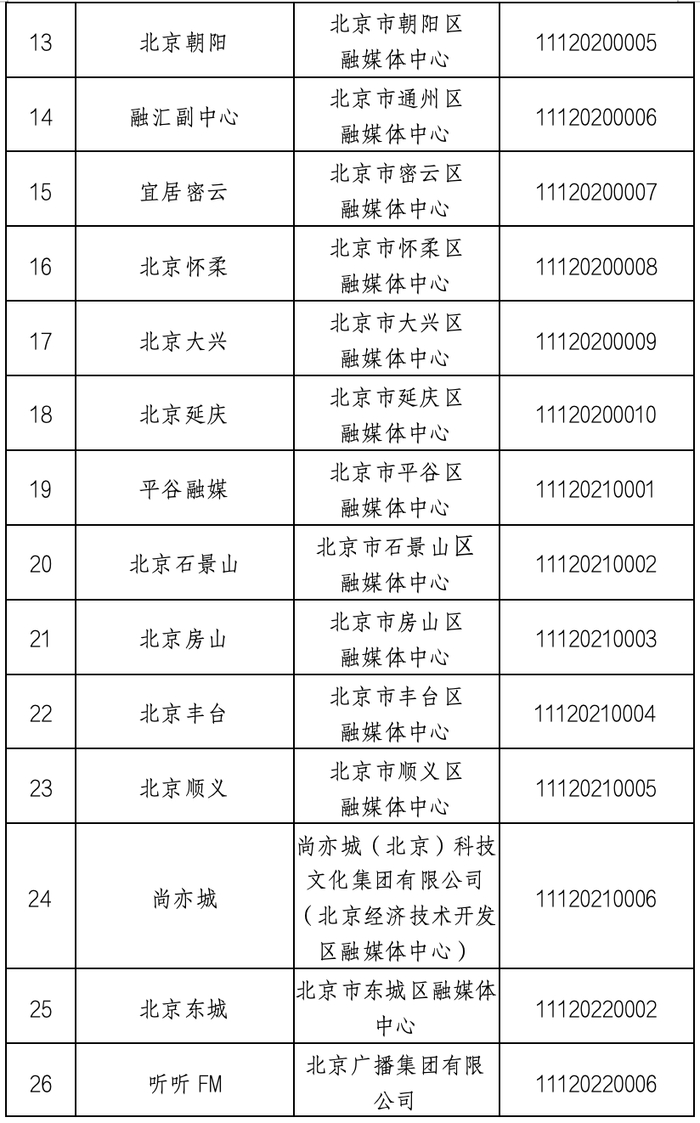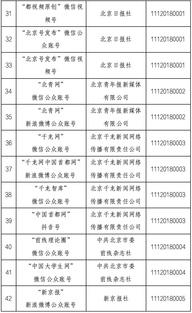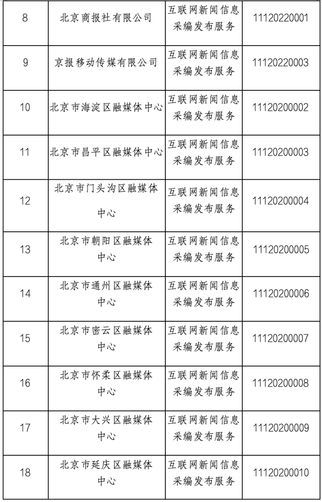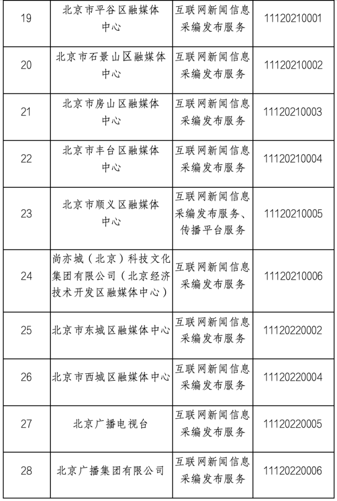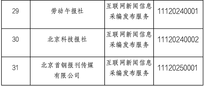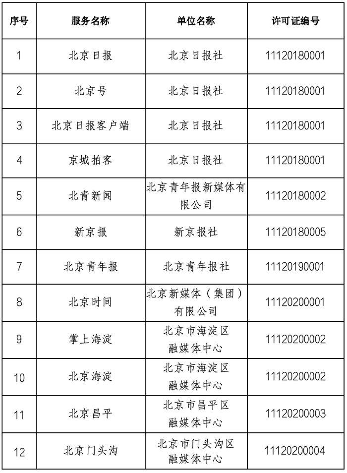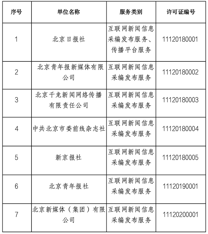截至2025年12月31日,由北京市互联网信息办公室批准的互联网新闻信息服务单位共31家,分别是:北京日报社、北京青年报新媒体有限公司、北京千龙新闻网络传播有限责任公司、中共北京市委前线杂志社、新京报社、北京青年报社、北京广播电视台、北京广播集团有限公司、北京新媒体(集团)有限公司、北京商报社有限公司、京报移动传媒有限公司、北京市海淀区融媒体中心、北京市昌平区融媒体中心、北京市门头沟区融媒体中心、北京市朝阳区融媒体中心、北京市通州区融媒体中心、北京市密云区融媒体中心、北京市怀柔区融媒体中心、北京市大兴区融媒体中心、北京市延庆区融媒体中心、北京市平谷区融媒体中心、北京市石景山区融媒体中心、北京市房山区融媒体中心、北京市丰台区融媒体中心、北京市顺义区融媒体中心、尚亦城(北京)科技文化集团有限公司(北京经济技术开发区融媒体中心)、北京市东城区融媒体中心、北京市西城区融媒体中心、劳动午报社、北京科技报社、北京首钢报刊传媒有限公司。其中,获得采编发布服务许可31家、传播平台服务2家。具体服务形式包括:互联网站18个,应用程序30个,公众账号194个,网络直播1个,其他1个,共244个服务项。