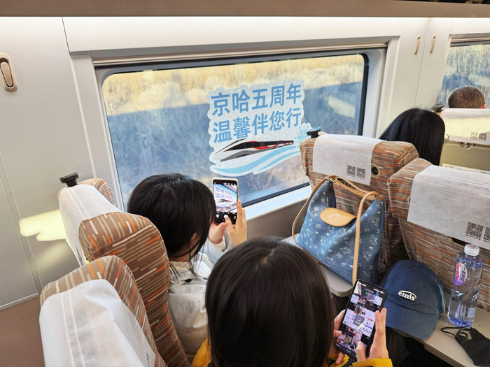 乘客在列车上拍摄京哈高铁五周年标识的照片留念