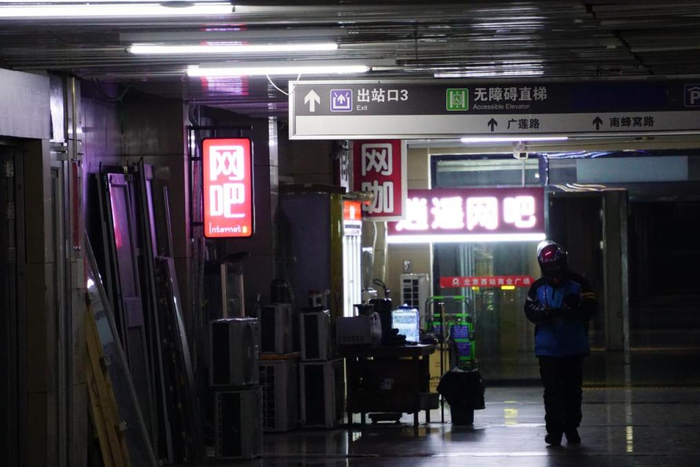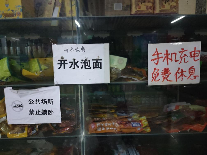 餐厅大部分停业,超市锁上了门,“手机充电免费休息”“开水泡面免费休息”的招牌还在,但看不见工作人员的身影。往广场深处走,逍遥网吧的灯箱明晃晃地亮着,有外卖小哥抬头左右张望再三确认,把咖啡送了进去。