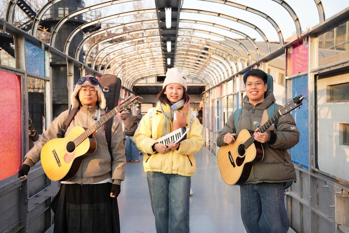 故宫角楼的夕阳下,他们唱《送别》,引来路人大合唱;鼓楼旁的站台下,老歌响起,红墙灰瓦映着旋律;什刹海岸边,歌声混着笑声,层层荡开……对靓仔来说,走唱让她真正融入了人群;对谭武和潇覃而言,这种不设边界的演出方式,让音乐回到了最初的状态。“以前觉得,站在台上和观众之间隔着一道无形的墙,现在边走边唱,才发现,原来音乐能把心与心的距离拉得这么近。”靓仔说这话时,眼睛里闪着光。