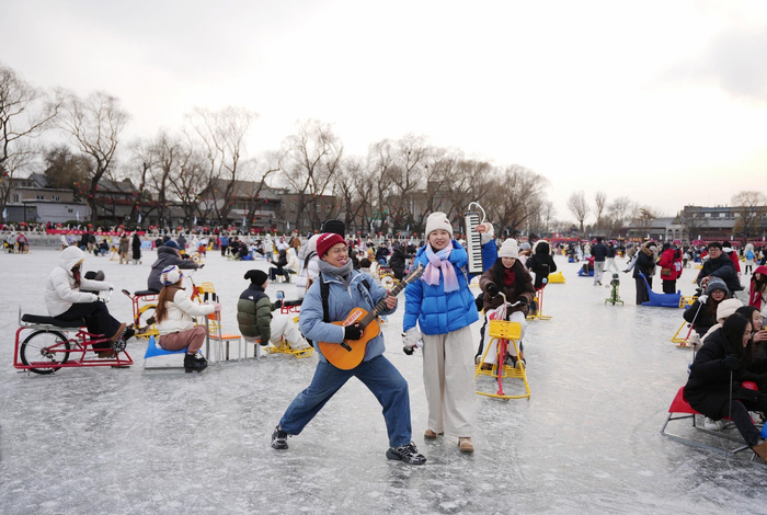 2026年初雪过后的什刹海冰场,冰面覆着一层薄雪,在冬日暖阳下泛着细碎的光。一阵熟悉的旋律穿透清冽的空气——“还记得你说家是唯一的城堡……”几个年轻人边走边唱,《稻香》的旋律在冰面上回荡,数百名游客自发加入合唱。蹬着冰车的人们连成长龙,跟着节奏左右摇摆,手里的滑冰棍随着旋律挥舞,一张张笑脸映着冰面的反光,成为什刹海冬日里最鲜活的画面。